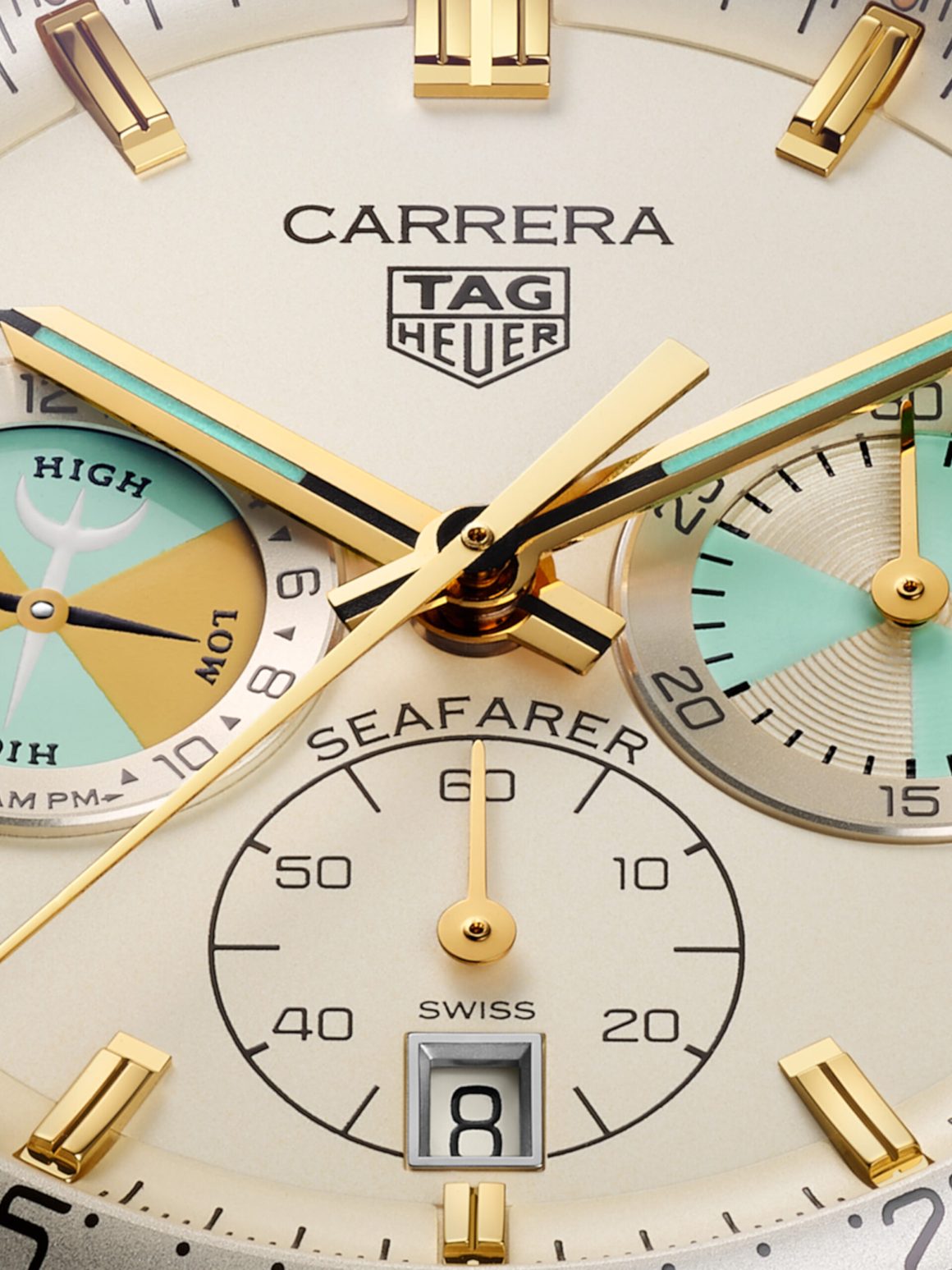 Şampanya tonlarındaki kadran, parlak altın renkli indeksler ve ibrelerle zarif bir kontrast yaratırken; saat 3 ve 9 yönlerindeki alt kadranlarda kullanılan pastel detaylar modele belirgin bir deniz karakteri kazandırıyor. TAG Heuer Carrera Seafarer Chronograph, sınırlı üretim değil.